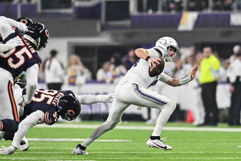 On the next possession, the Bears committed a turnover when Vikings pass rusher Jonathan Greenard sacked Williams from the blind side and popped the ball loose. Vikings linebacker Blake Cashman recovered the fumble and returned it 16 yards to the Chicago 39-yard line.